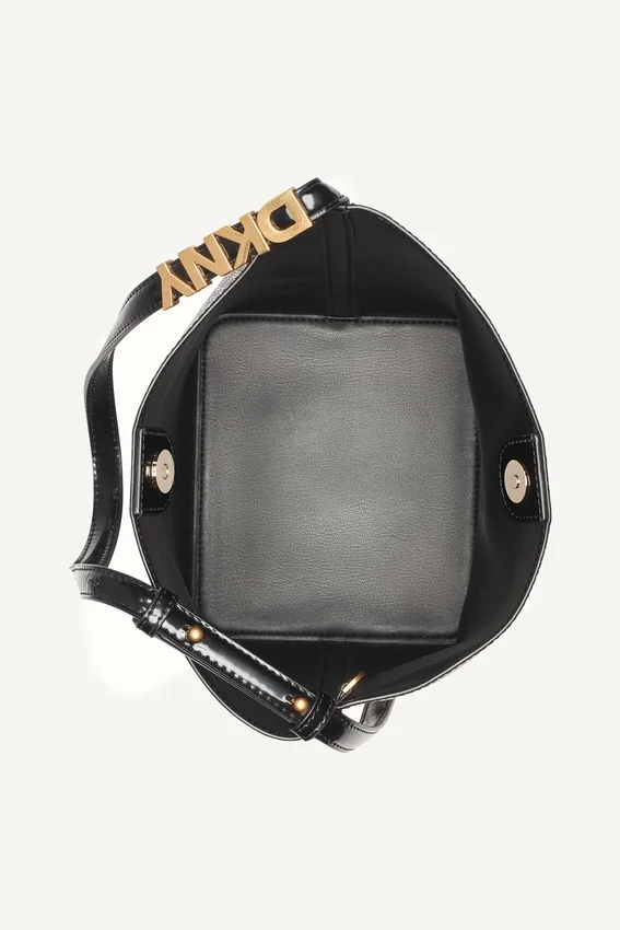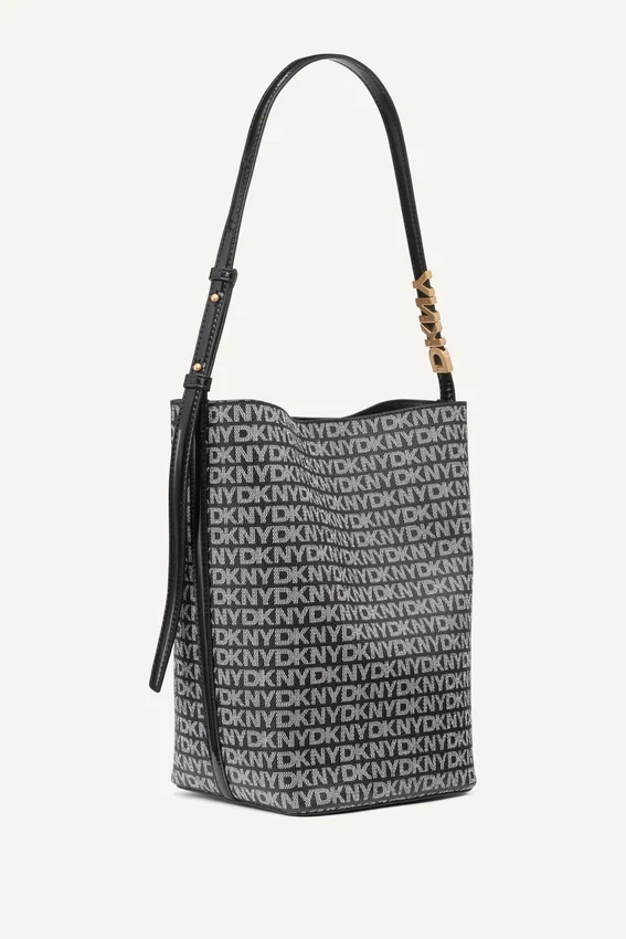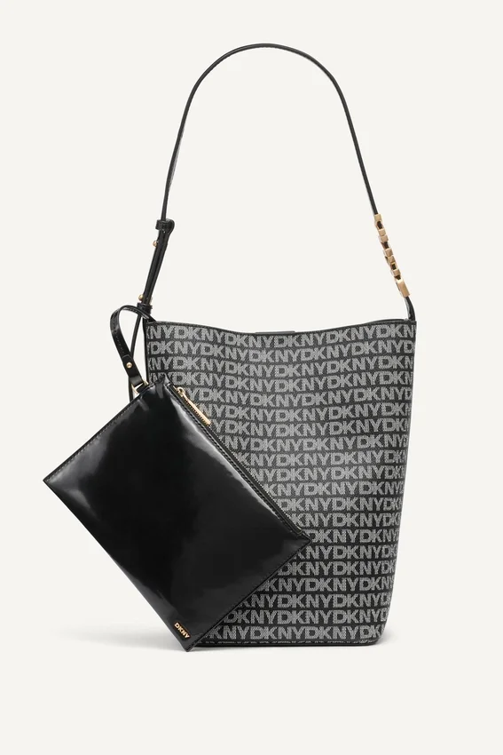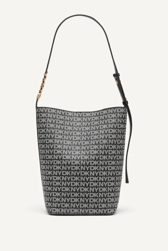 Your Daily Lineup–Earbuds, Keys, Sunnies, and Wallet–Fits Perfectly in This Logo Bucket Bag, Finishing a Cozy Cable Sweater Set.