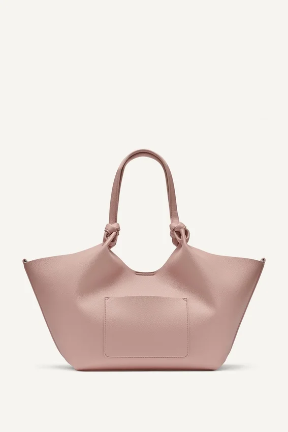 - Exterior Back Slip Pocket; Knotted Dual Top Handles; Magnetic Snap Tab Fastening