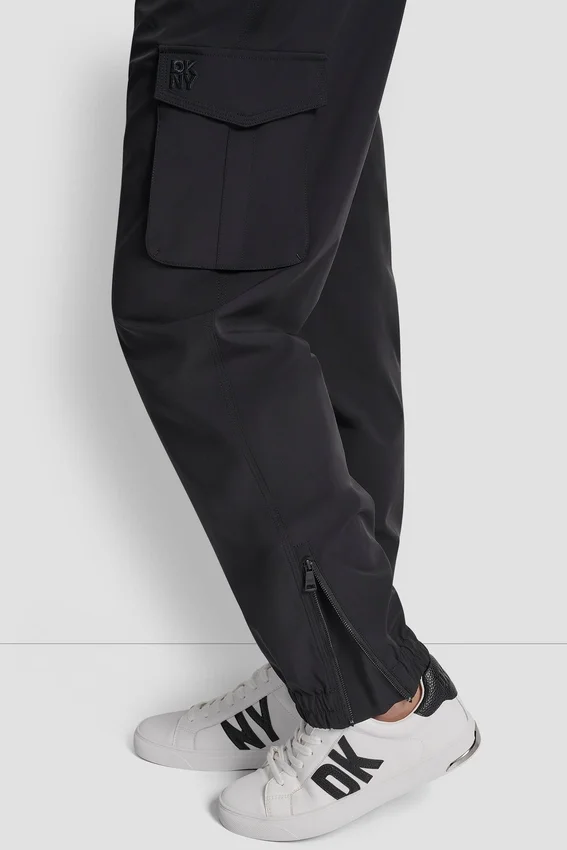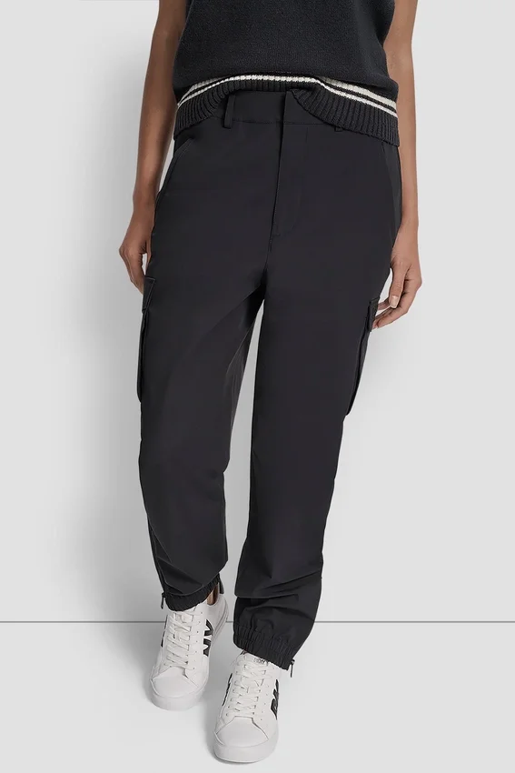 High Waist Cargo Jogger with Zipper Ankles Zipper and Hook Bar Closure High-Rise Fit Front Slant Pockets; Two Back Pockets Woven Construction with Knit Overlay Ankle Zip Openings for Adjustable Fit Unlined Body: 84% Nylon, 16% Elastane Spandex Sleeves: 60% Viscose Rayon, 31% Nylon, 9% Elastane Spandex Embroidery: 100%