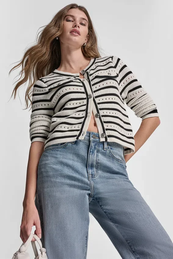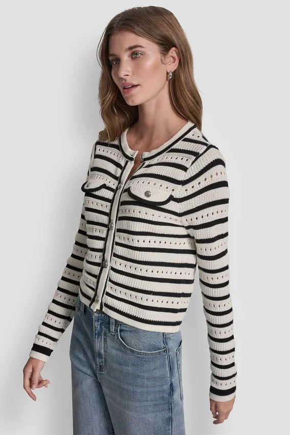 A Refined Layering Essential, This Pointelle Striped Cardigan Features Elegant Tipped Detailing and Regal Buttons for a Polished Finish. Crafted from Breathable Cotton with an Open-Stitch Texture, It Delivers Timeless Style with Lightweight Comfort.