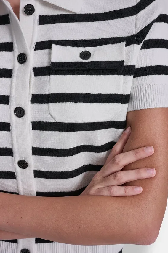 A Classic Striped Polo Cardigan with Short Sleeves and Chest Pockets, Perfect for Layering over Tees or Pairing with Skirts and Jeans.