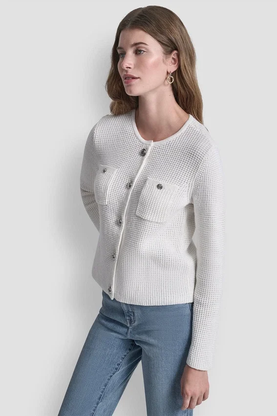 A Timeless Layering Essential, This Tuck Stitch Cardigan Features a Classic Crew Neckline, Front Button Closure, and Chest Pockets for a Polished Yet Relaxed Look. Crafted in Breathable Cotton, It Delivers Everyday Comfort with Elevated Texture.