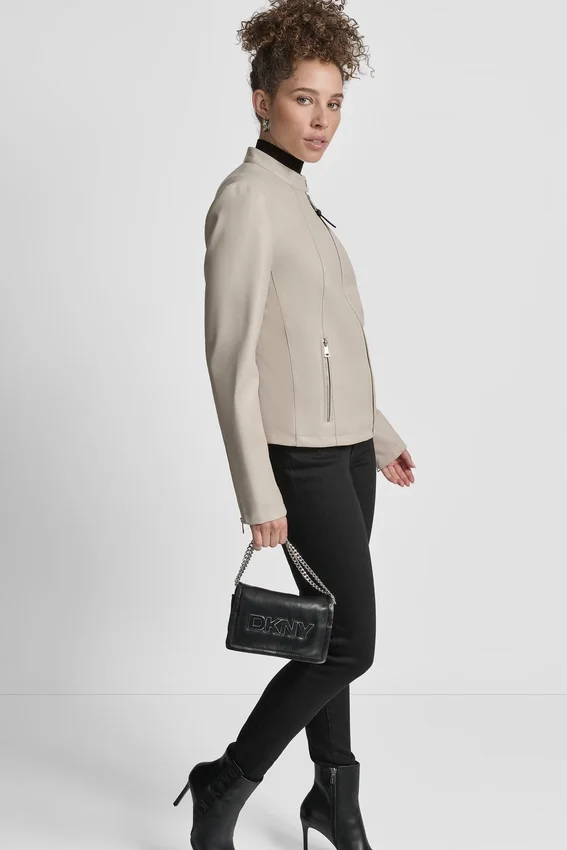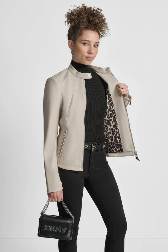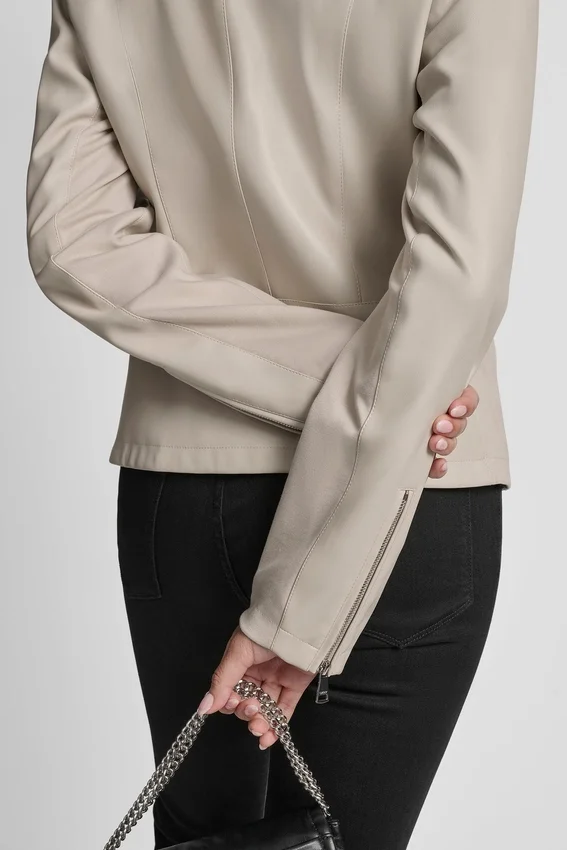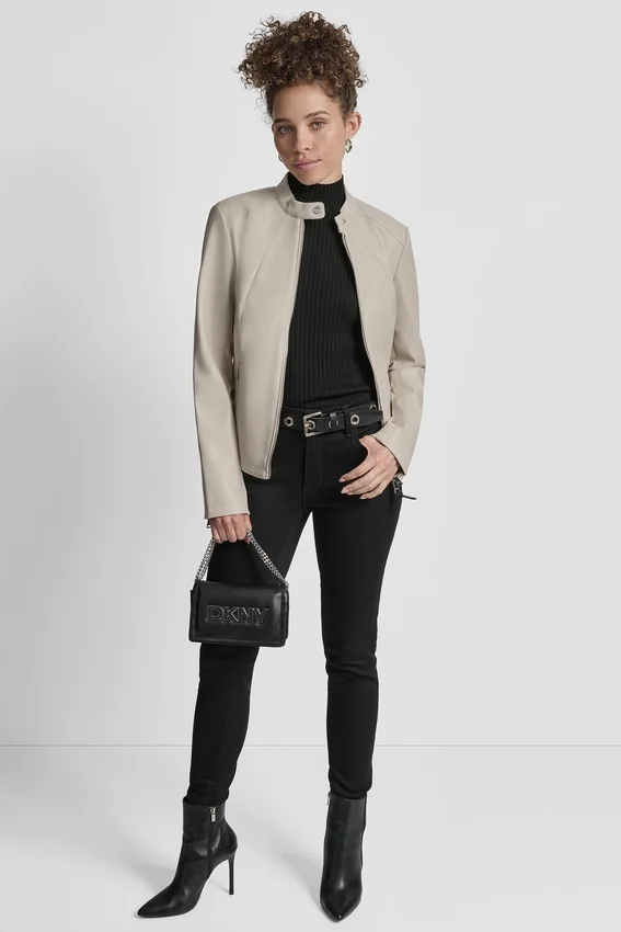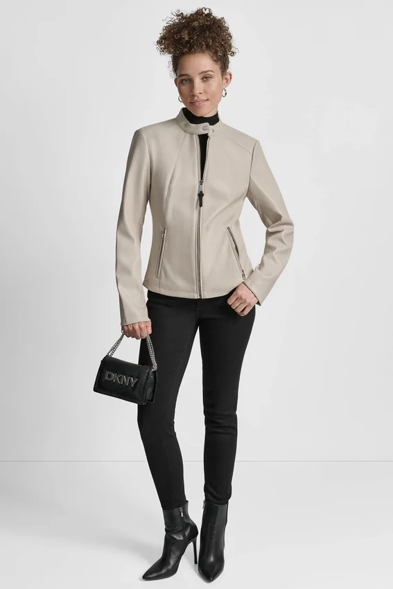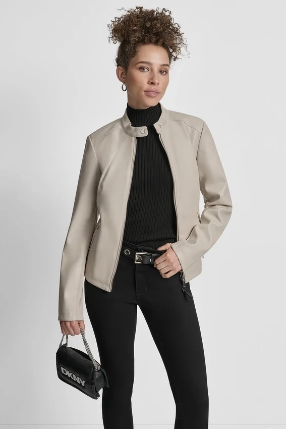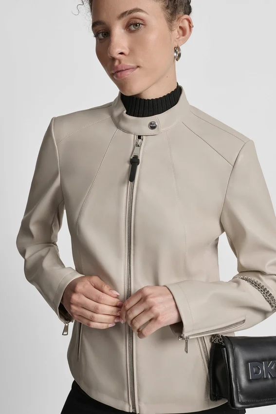 Long Sleeve Front Zipper Closure Snap Collar Moto Style Zipper Pockets at Side Zipper Detail on Sleeves Vegan Leather Origin: Imported Style# Dl5Mpy38