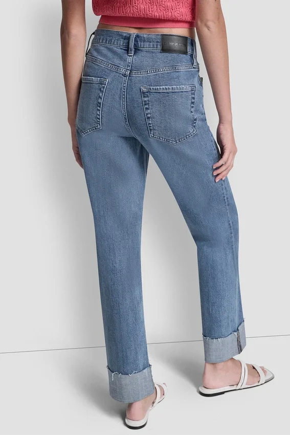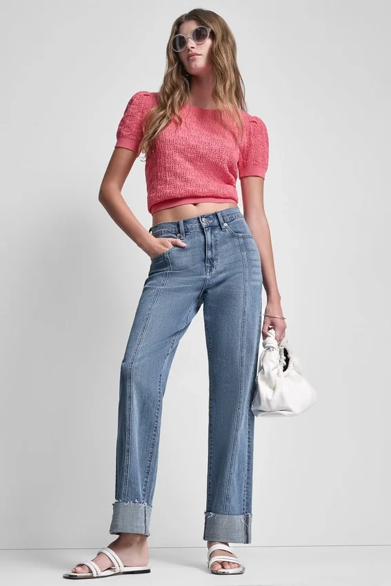 A Forever Denim Staple with a Modern Edge, This High-Rise Straight-Leg Jean Features Clean Seaming and a Raw-Edge Cuff That Elevates Everything from a Crisp Tee to a Tailored Blazer