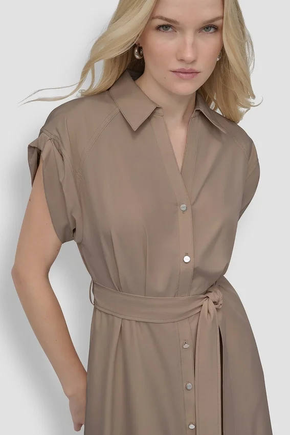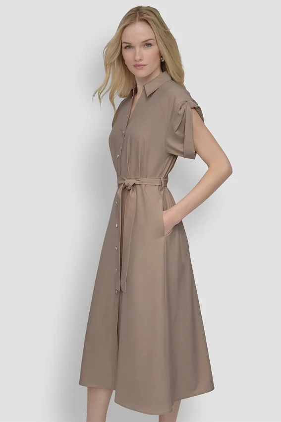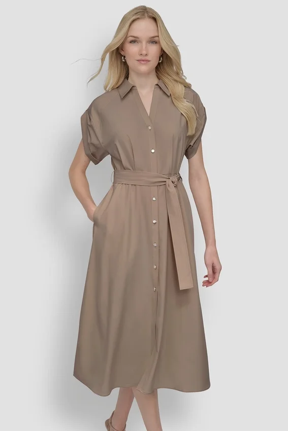 Polished and Versatile, This Midi Shirt Dress Features Extended Sleeves, a Classic Collar, and a Button-Front Design. The Adjustable Tie Waist Creates a Flattering Silhouette, Making It Ideal for Work-To-Weekend Styling.
