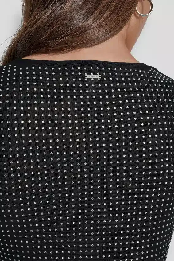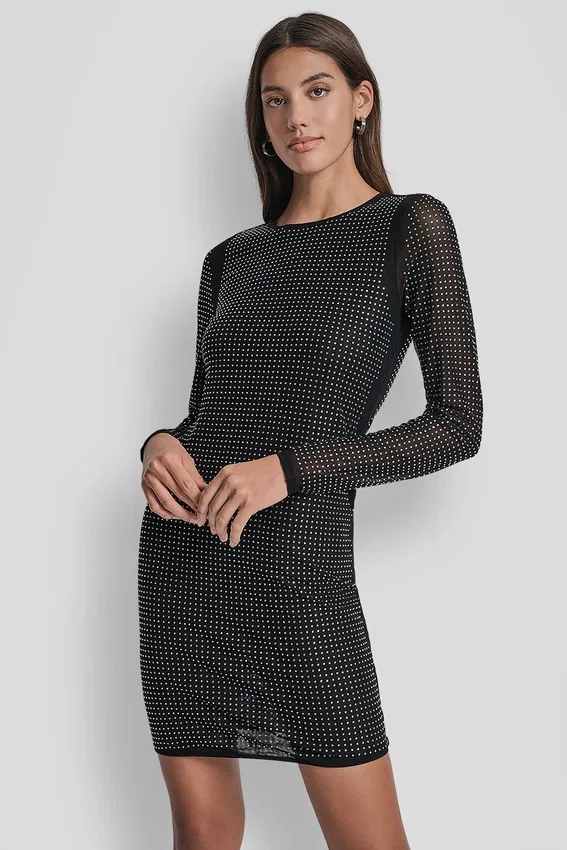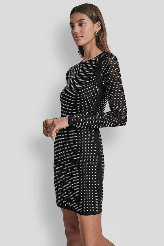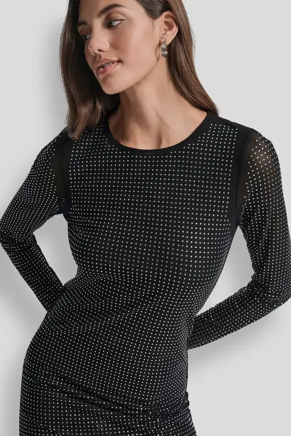 A Chic Casual Knit Dress Featuring Mesh Panels with Dome Stud Detailing, Perfect for Everyday Elegance or a Night Out.