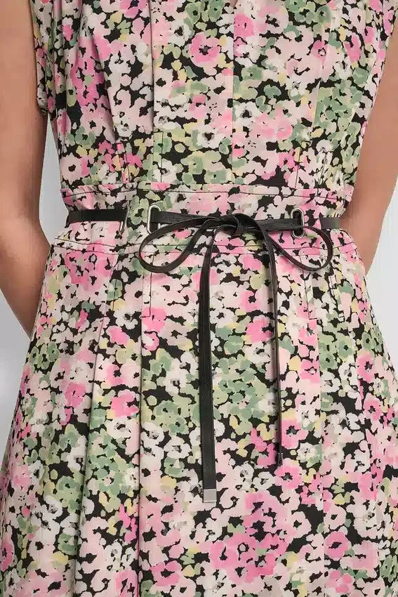 Sleeveless V-Neck Floral-Print Pleated Fit and Flare Midi Sundress Back Zip Fastening Removable Tie-Belt Included Partially Lined Cupro: Main: 88% Polyester, 12% Spandex; Partial Lining: 100% Polyester Dry Clean Only Imported Style #: Dd611S11