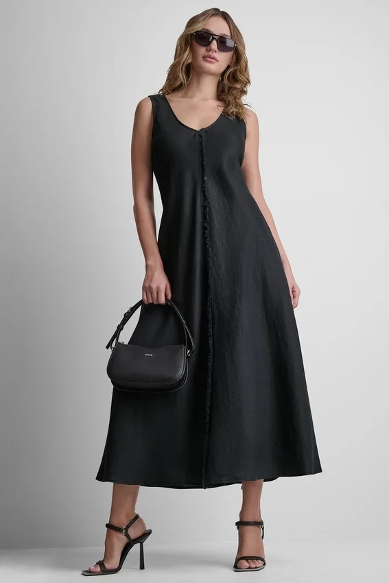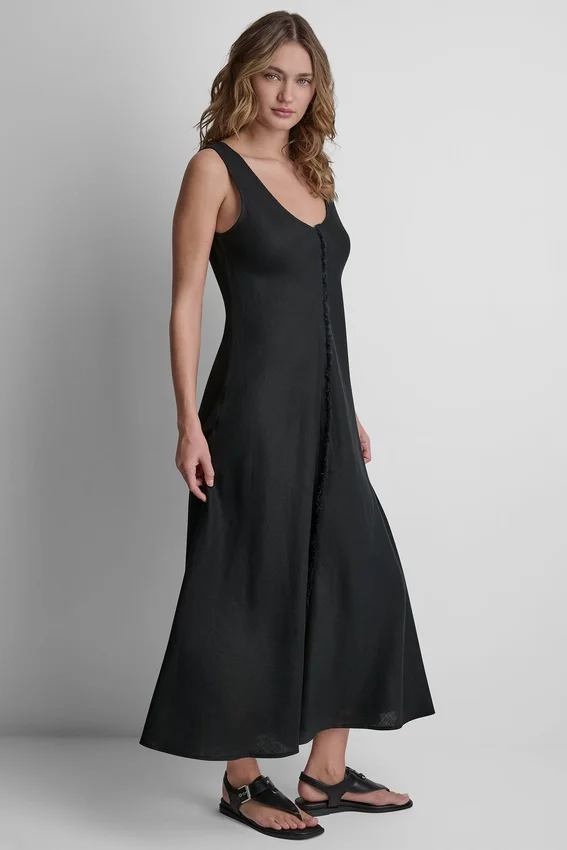 - Sleeveless V-Neck Frayed Seam Maxi Dress
