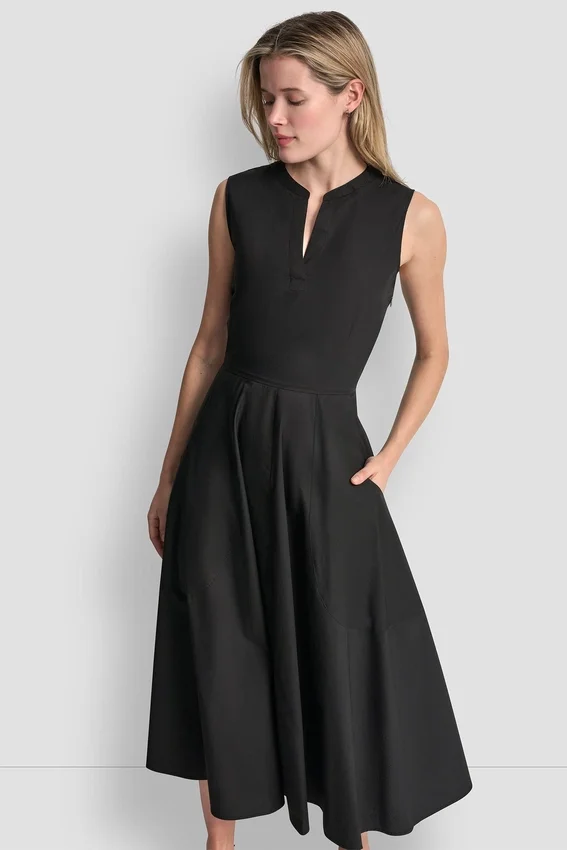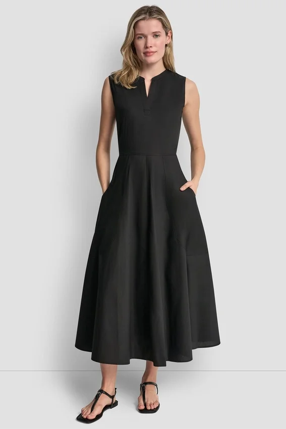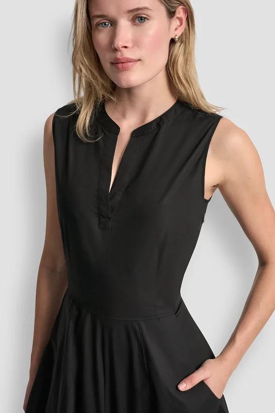 Sleeveless Henley Neckline with V-Neck Detail Back Zipper Closure On-Seam Zip Pockets Midi Length Crisp Poplin Fabrication;100% Cotton Machine Wash Cold, Gentle Cycle with Like Colors; Only Non-Chlorine Bleach When Needed; Tumble Dry Low; Warm Iron if Needed; Or Dry Clean Imported Style #: Dj6D9193