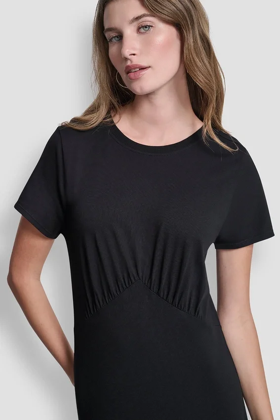 Short-Sleeve Maxi Dress Pull-On Styling Crew Neckline Ruched Bodice with Tiered Skirt Slim Fit Unlined Fabric: 100% Cotton Care: Machine Wash Cold with Like Colors Inside out Only. Gentle Cycle. Only Non-Chlorine Bleach When Needed. Dry Flat. Cool Iron if Needed. Do Not Dry Clean. Imported Style #: Dj6D9175