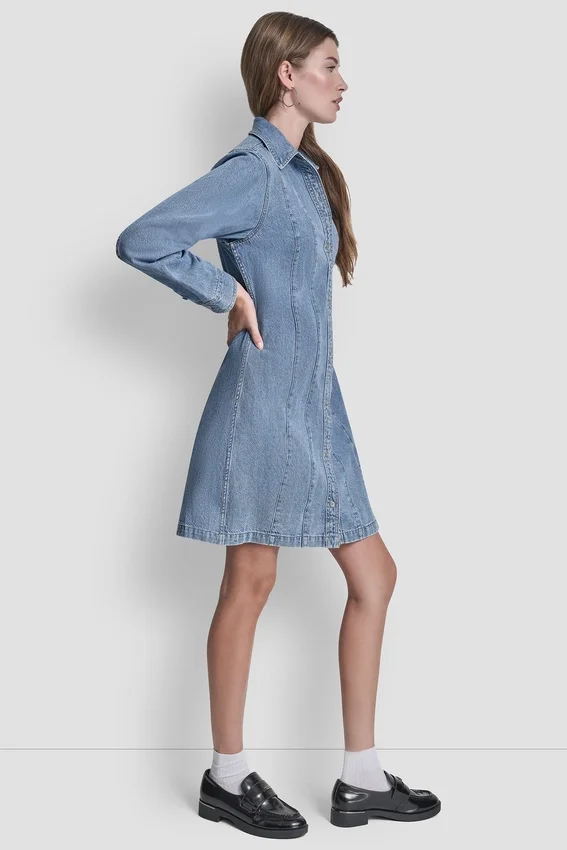Button Front Closure Long Sleeves Seamed A-Line Silhouette Unlined Design Knee-Length No Pockets Fabric: 100% Cotton (Denim) Care: Machine Wash Cold with Like Colors, Only Non-Chlorine Bleach When Needed, Tumble Dry Low, Warm Iron if Necessary. Imported Style #: Dj6D9171