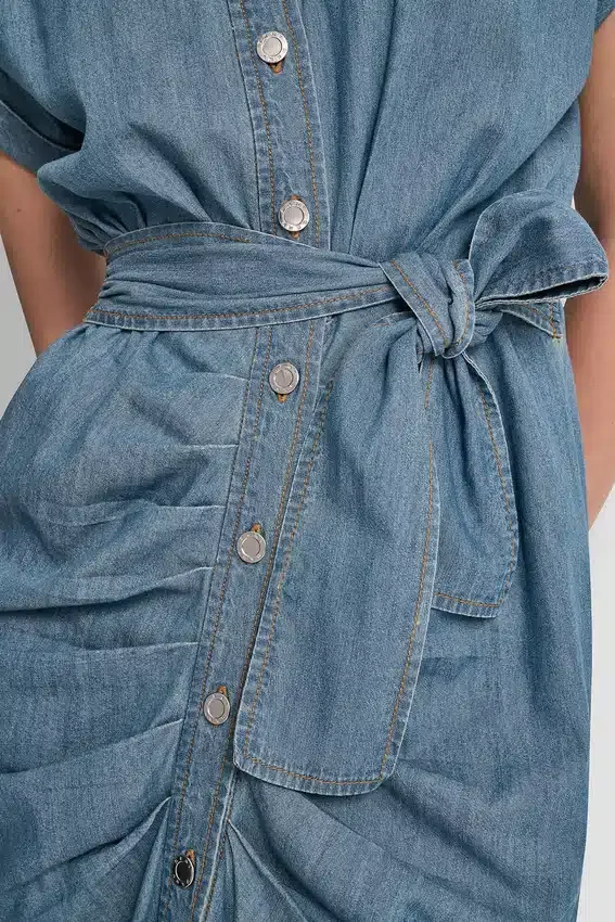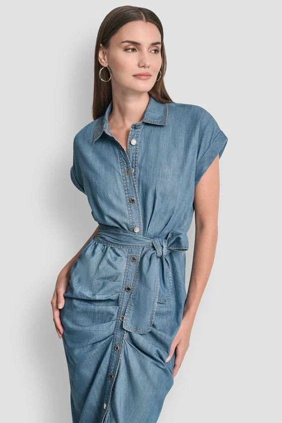 This Ruched Midi Dress Makes a Compelling Case for a More Streamlined Take on Denim—Especially When Styled with Classic Heels and a Sleek East West Shoulder Bag.
