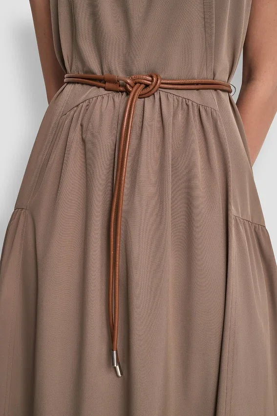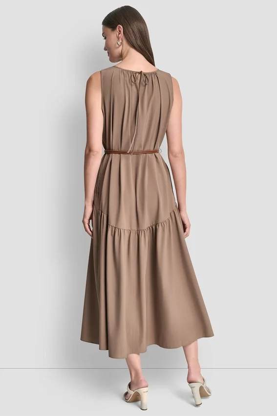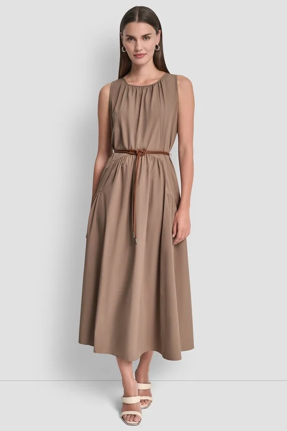 Sleeveless Crew-Neck Drop-Waist Midi Dress Pulls on, with Keyhole Tie Fastening in Back Removable Tie-Belt Included On-Seam Hip Slip Pockets Unlined Cupro: 88% Polyester, 12% Spandex Hand Wash Cold–Do Not Dry Clean or Bleach–Line Dry Imported Style #: Dd611S08