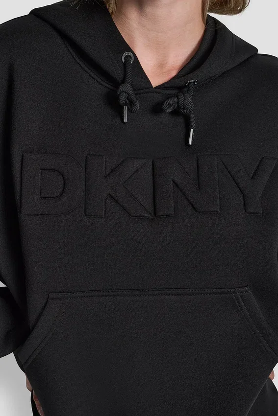 - Long Drop-Shoulder Sleeve Logo Embossed Sweater with Drawstring Hood