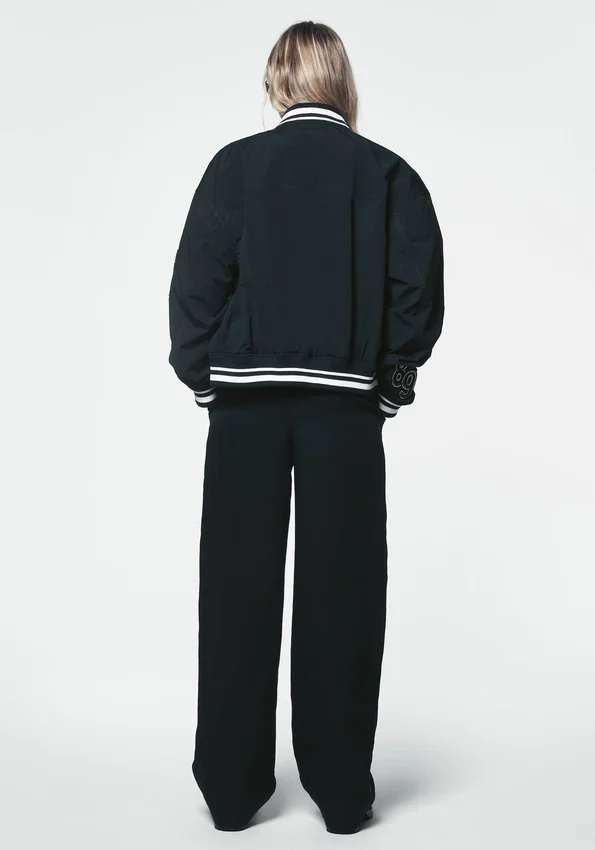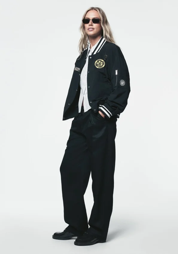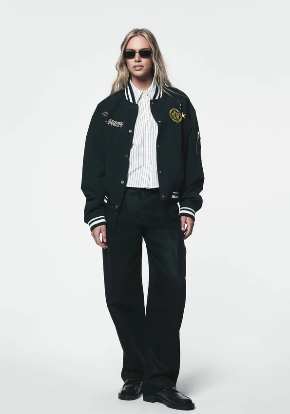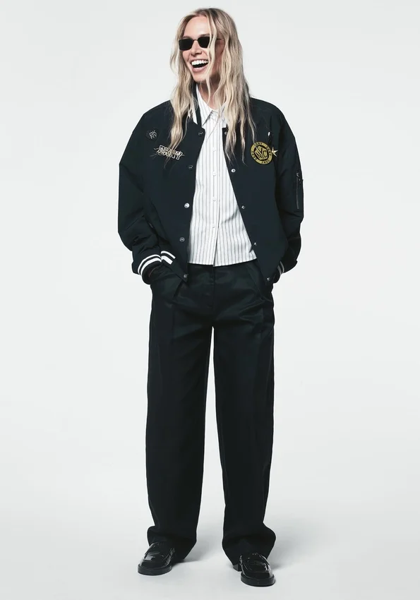A Sporty Throwback with a Playful Edge, This Pins-And-Patches Varsity Jacket is Made to Be Styled Your Way. Toss It over a Simple Top and a Mini Denim Skirt for an Easy Off-Duty Look That Feels Cool, Confident, and a Little Nostalgic.