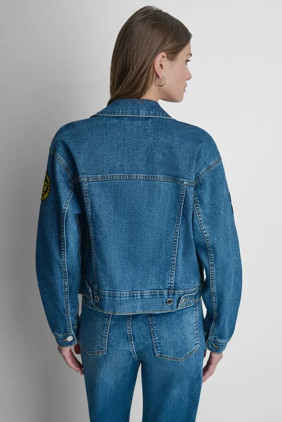 - Long-Sleeve Point-Collar 1989 Pins and Patch-Embellished Denim Trucker Jacket