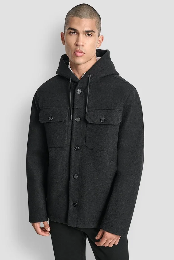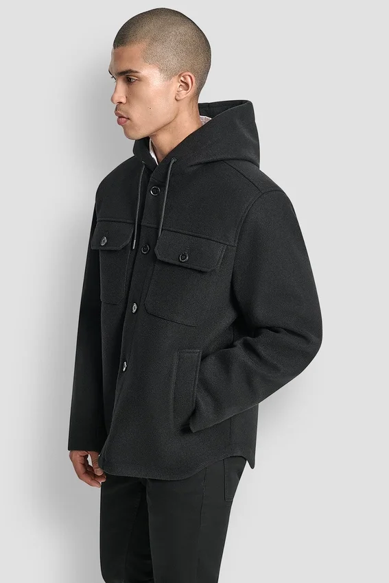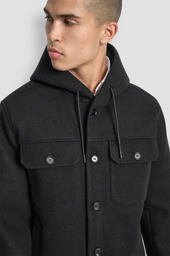 This Versatile Jacket Reimagines Classic Outerwear with a Sleek, Structured Faux Wool Blend and a Streamlined Hooded Design—Tailored for Cooler City Days.