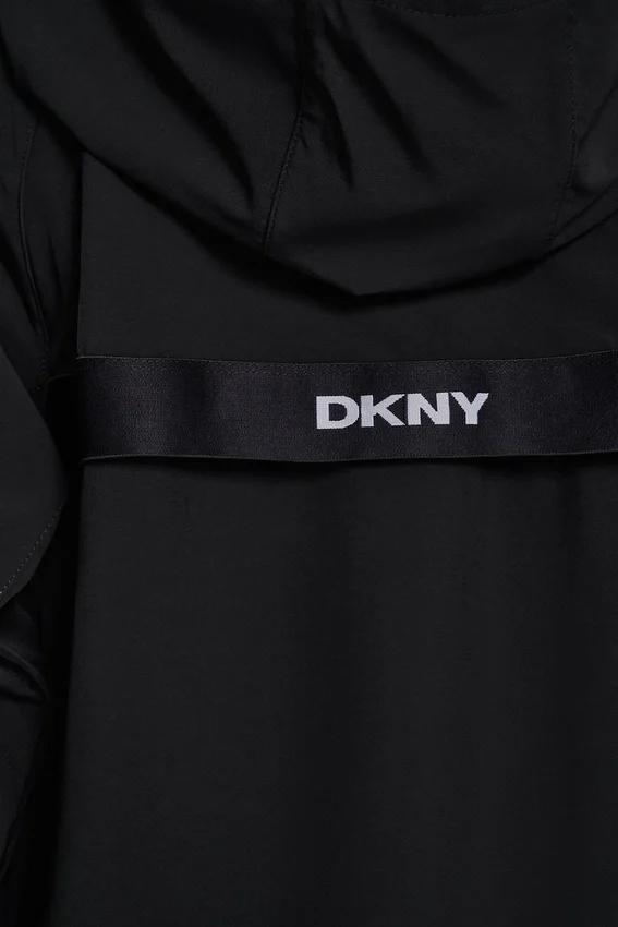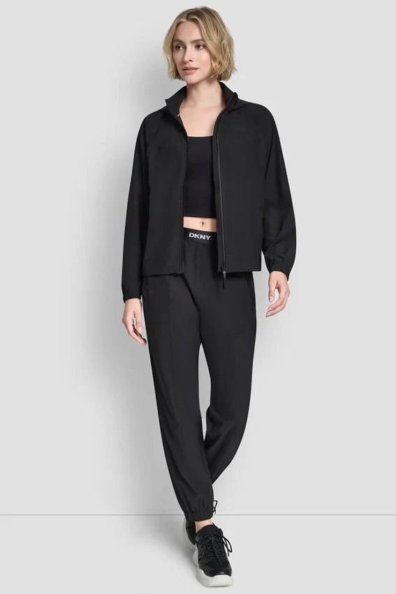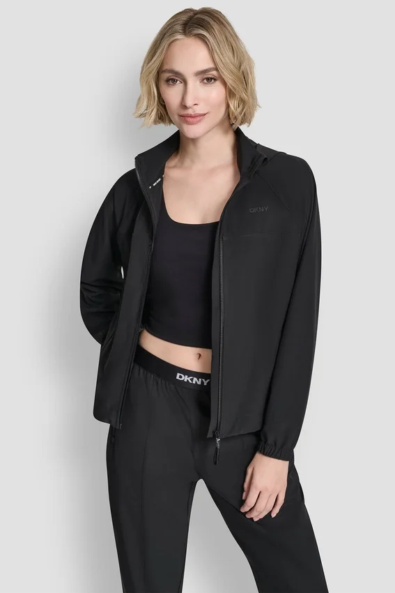 - Long Raglan Sleeve Logo-Trimmed Mock-Neck Jacket with Hood and Elastic Hem