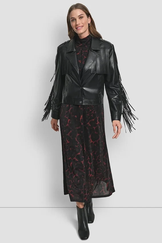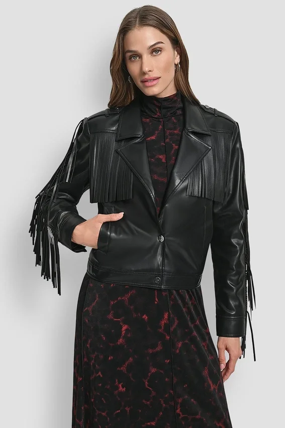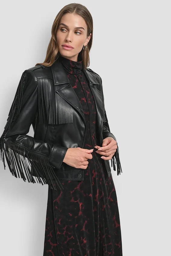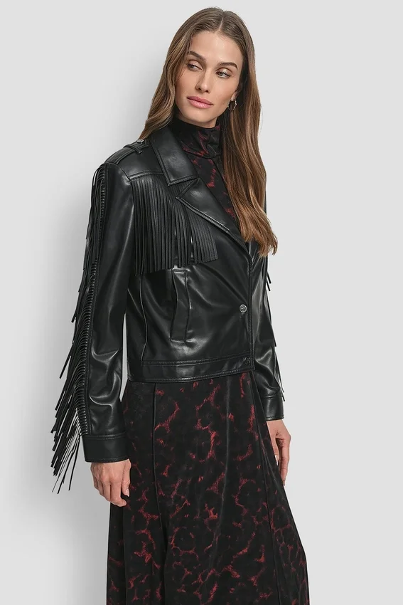 Effortlessly Cool with a Western-Inspired Edge, This Faux-Leather Jacket Stands out with Playful Fringe Detailing and a Buttery-Soft Hand Feel. Designed in Dkny’s Signature Butter Pu, It Delivers a Sleek, Luxe Look While Staying Lightweight and Easy to Wear. Perfect for Layering over Everything from Tees to Dresses.