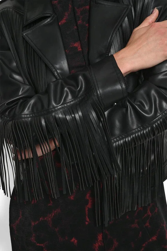 Long Sleeve Fringe Jacket Classic Collared Neck with Snap-Front Closure for a Clean, Modern Finish Statement Fringe Detailing Along the Sleeves and Back for a Bold, On-Trend Look Two Hip Pockets for Functional Style Crafted from a Soft Butter Pu Fabrication (Face: 100% Polyurethane; Backing: 100% Polyester) with a Smoo