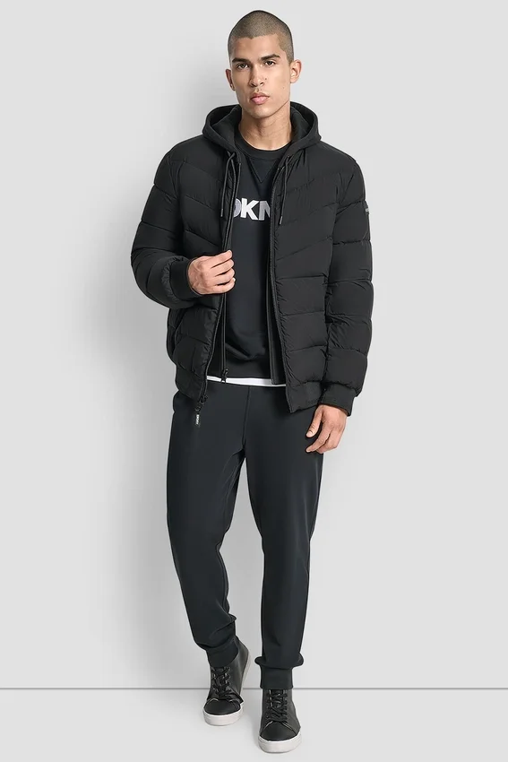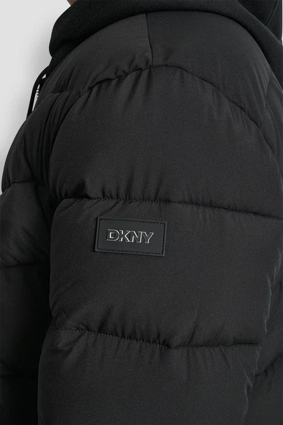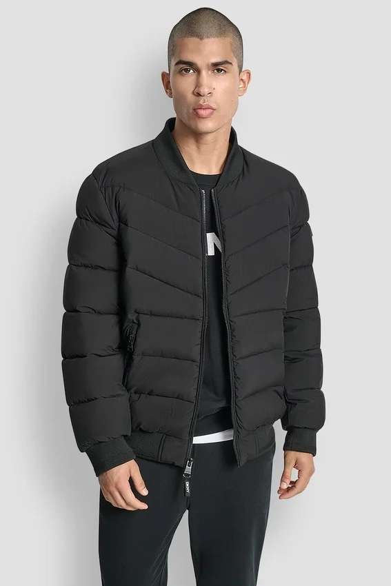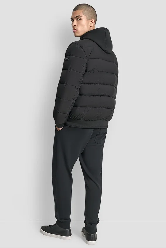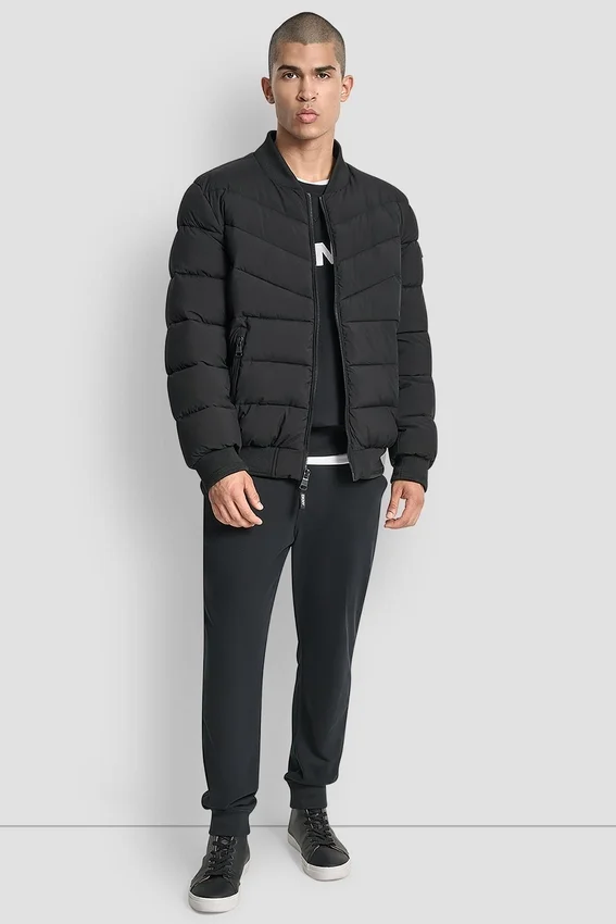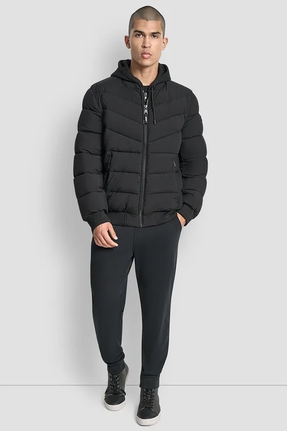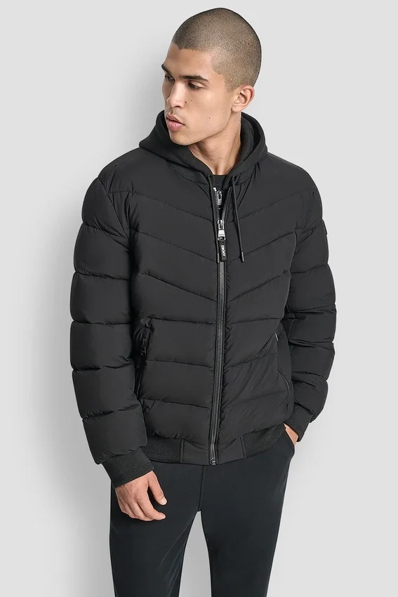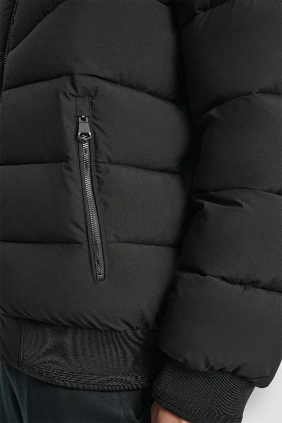 Stretch Bomber Puffer with Hooded Bib Front Zip Closure; Ribbed Hem and Cuffs; Detachable Hooded Bib Detail Shell: 100% Polyester with Clear Polyurethane Lamination Machine Wash Cold Separately, Gentle Cycle; Only Non-Chlorine Bleach When Needed; Do Not Use Fabric Softener; Tumble Dry Low; Cool Iron if Needed Imported