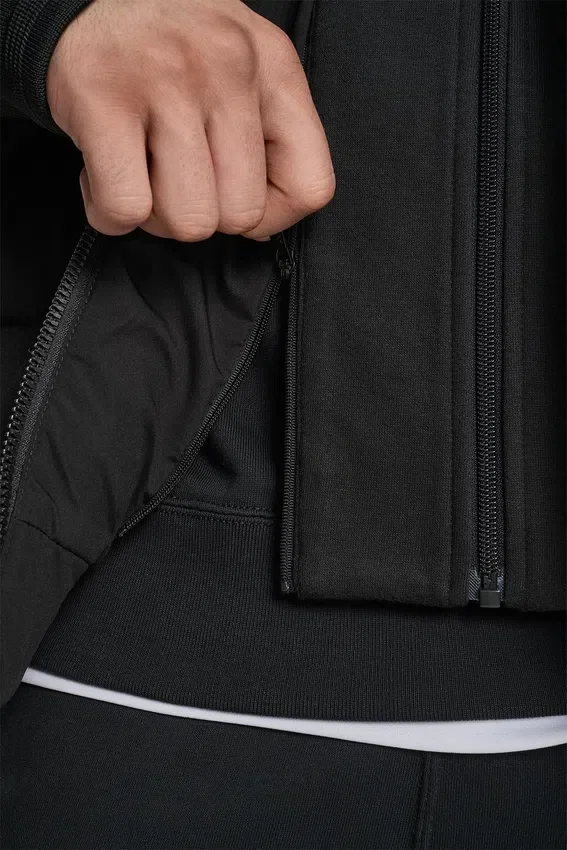 - Front Zip Closure; Ribbed Hem and Cuffs; Detachable Hooded Bib Detail