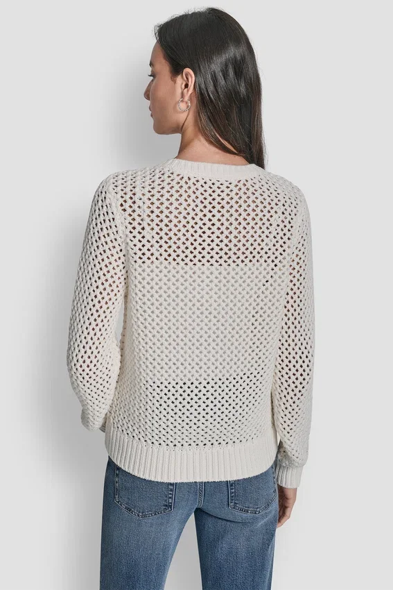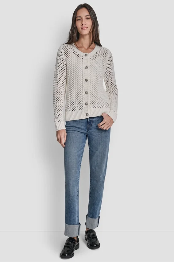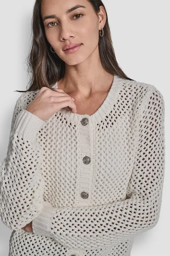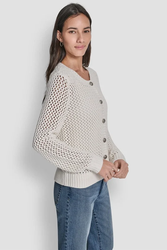 Front Button Closure Unlined Knit: 60% Cotton, 40% Acrylic Machine Wash Cold with Like Colors, Inside out Only Only Non-Chlorine Bleach When Needed Tumble Dry Low; Low Iron if Needed Open-Stitch Pattern Crew Neckline Long Sleeves Imported Style #: Dj5R0639