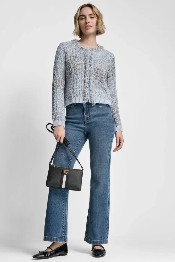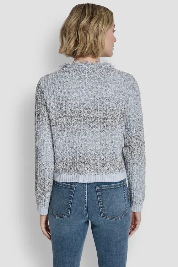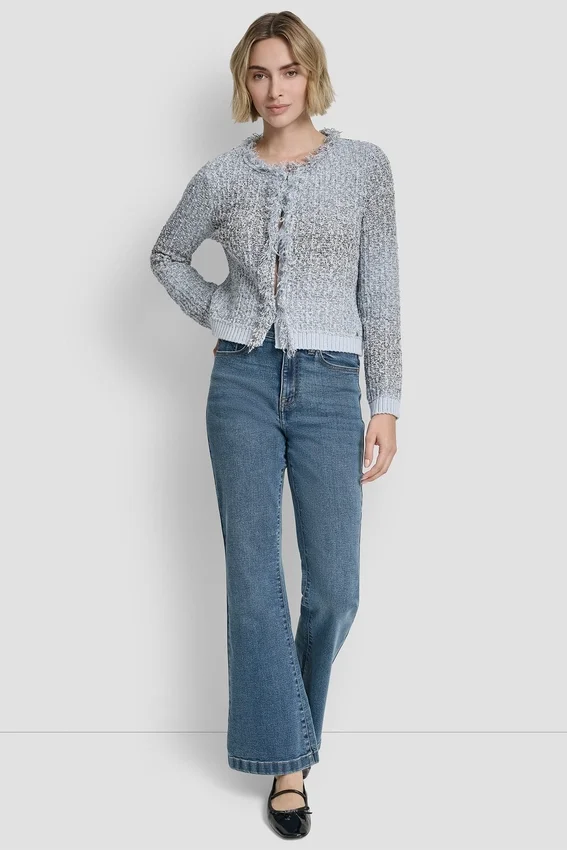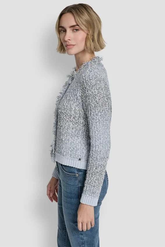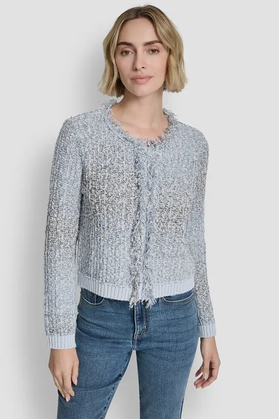 A Polished, Tweed-Inspired Layer, This Fringe-Trimmed Sweater Jacket Offers a Refined Take on a Classic Cardigan Silhouette. Textured Yarns and Contrast Combo Colors Elevate the Look with Subtle Dimension.