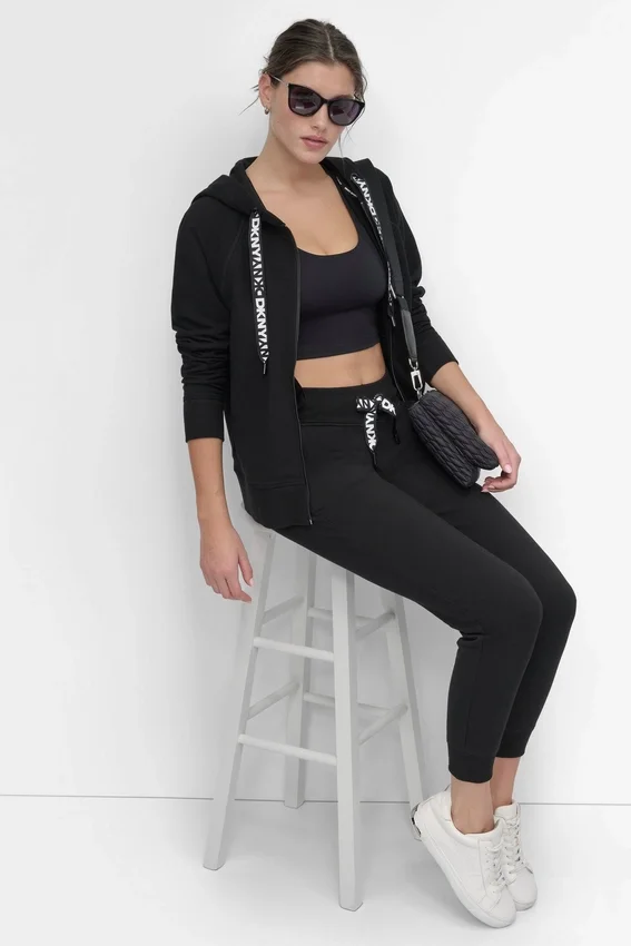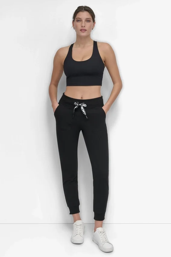 High-Rise Two-Tone Logo Drawstring Skinny Jogger Diagonal Hip Pockets; Pulls on, with Drawstring Elastic Waist Unlined French Cotton-Blend Jersey: 95% Cotton, 5% Spandex Machine Wash Cold Inside out–Do Not Bleach or Use Fabric Softener–Tumble Dry Low Imported Style #: Dp5P3496