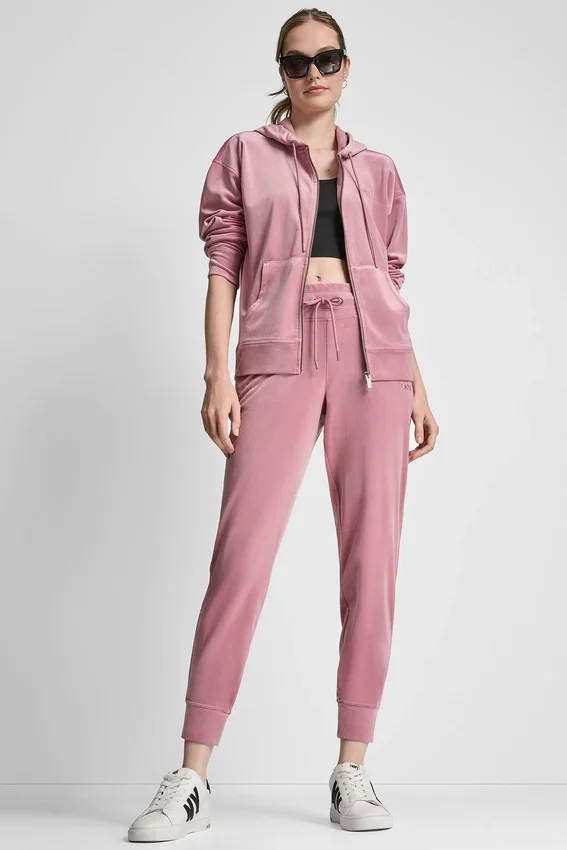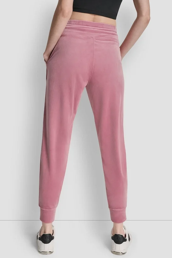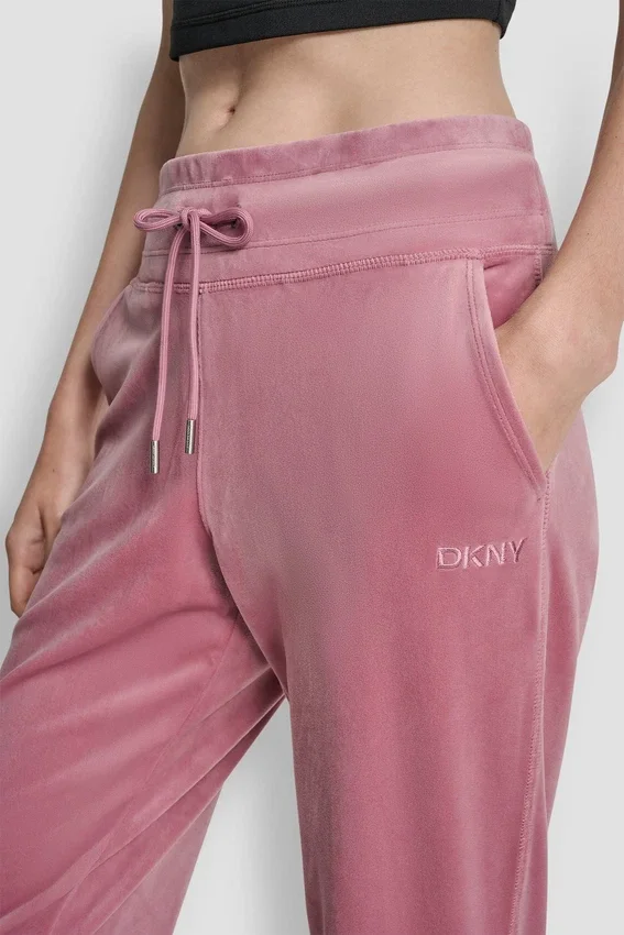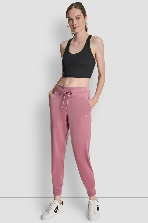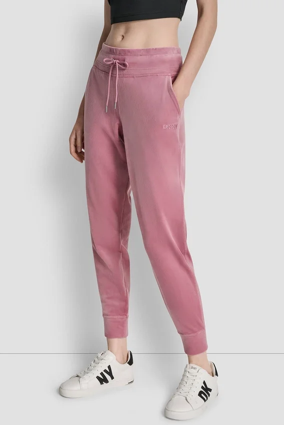 Mid-Rise Logo-Embroidered Slim Jogger Diagonal Hip Pockets; Pulls on, with Drawstring Elastic Waist Unlined Velour: 95% Polyester, 5% Spandex Machine Wash Cold Inside out–Do Not Bleach or Use Fabric Softener–Tumble Dry Low Imported Style #: Dp5P3694