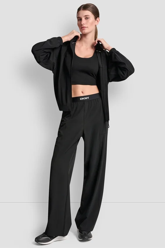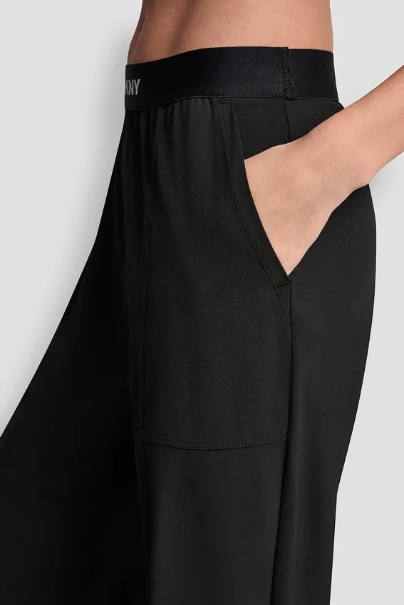 High-Rise Logo-Waist Wide-Leg Pant Pulls on, with Logo Elastic Waist Diagonal Hip Welt Pockets Unlined Tech-Woven: 89% Polyester, 11% Elastane (Spandex) Machine Wash Cold Inside out—Do Not Bleach or Use Fabric Softener—Tumble Dry Low and Remove Promptly Imported Style #: Dp6P3645