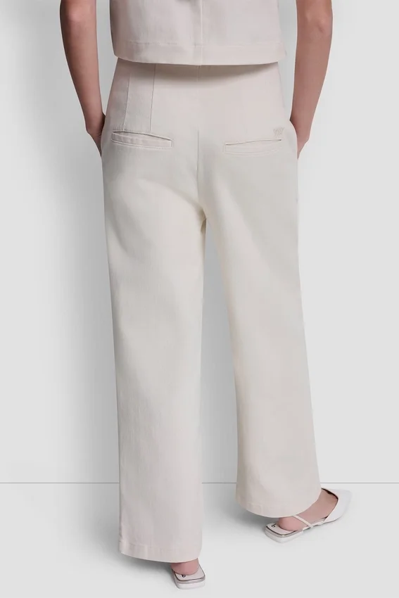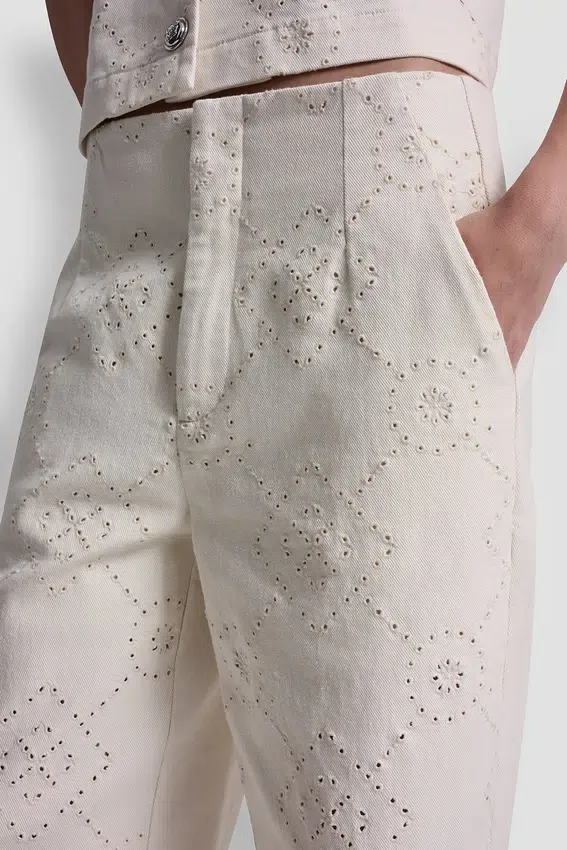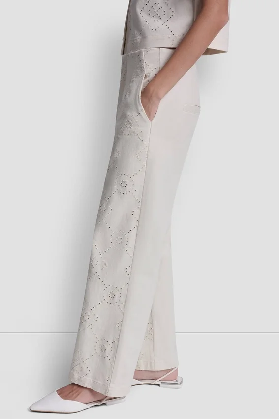 Modern and Polished, These High-Rise Ankle Pants Feature an Eyelet Front Detail with a Solid Back for a Refined Contrast. Crafted in Textured Stretch Twill, the Wide Leg Silhouette Delivers Effortless Sophistication and Comfort.