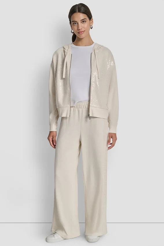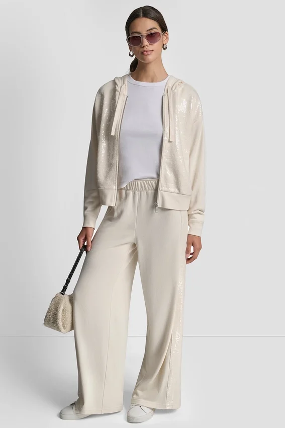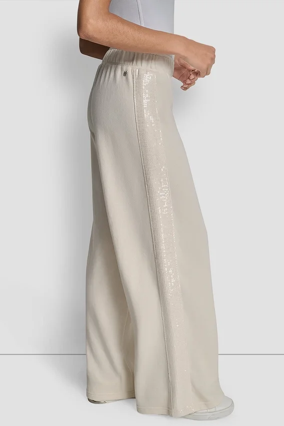 Elevate Your Off-Duty Look with a Hint of Shine. These Wide-Leg Pants Feature Tonal Sequin Side Stripes for Subtle Sparkle, While the Mid-Rise Fit and Elastic Waistband Keep Things Comfortable. Designed in a Soft Cotton Blend for Effortless Wear.