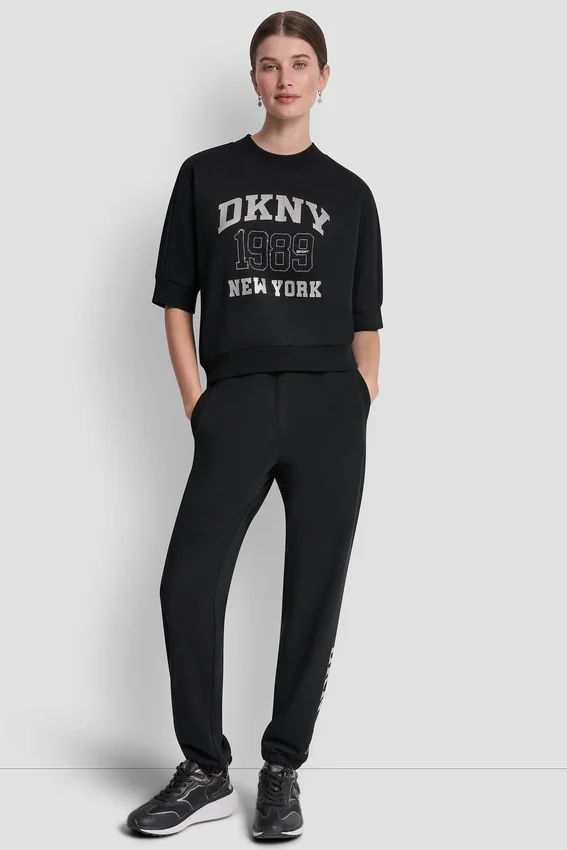 Sporty with a Touch of Shine, This Dkny Ny 1989 Logo Top Features Rhinestud Embellishment and a Modern High-Low Hem. Designed with Elbow Sleeves and a Relaxed Silhouette, It’s an Effortless Everyday Essential.