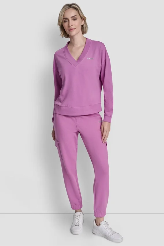 Long Drop-Shoulder Sleeve Deep V-Neck Metallic Bubble Logo Sweatshirt Pullover Unlined Cotton-Blend: 60% Cotton, 40% Polyester Machine Wash Cold Gentle Cycle, Lay Flat to Dry Imported Style #: Dp6T1644