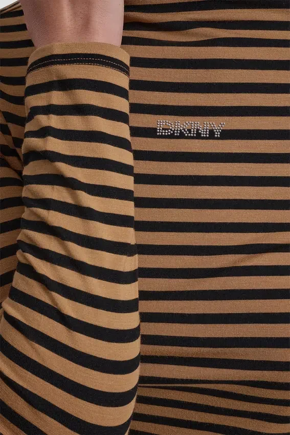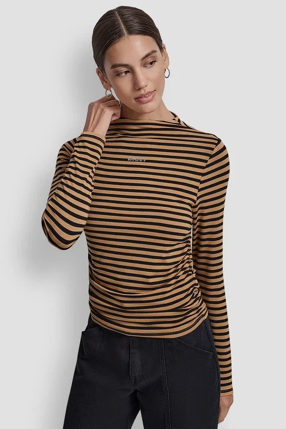 Sophisticated and Figure-Flattering, This Long-Sleeve Top Features Side Ruching and Subtle Rhinestud Logo Detailing for a Polished, Modern Look. Ideal for Both Workdays and Evening Outings.