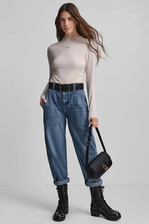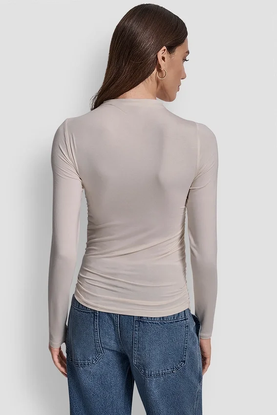 Side Ruched High Neck Long Sleeve Top with Rhinestone Logo Funnel Mock Neck with Pull-On Design Slim Fit for a Sleek Silhouette Long Sleeves Front Panel Lined with Self-Fabric 94% Rayon, 6% Spandex Blend Machine Wash Cold with Like Colors; Wash Inside out; Tumble Dry Low; Cool Iron if Needed; Do Not Bleach; Do Not Use