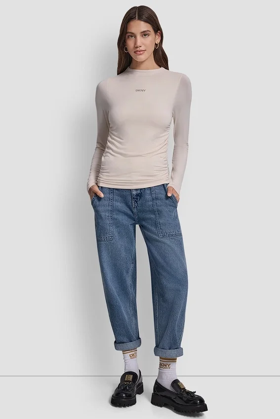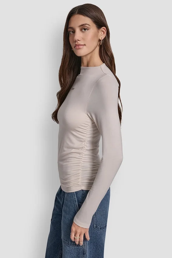 - Side Ruched High Neck Long Sleeve Top with Rhinestone Logo