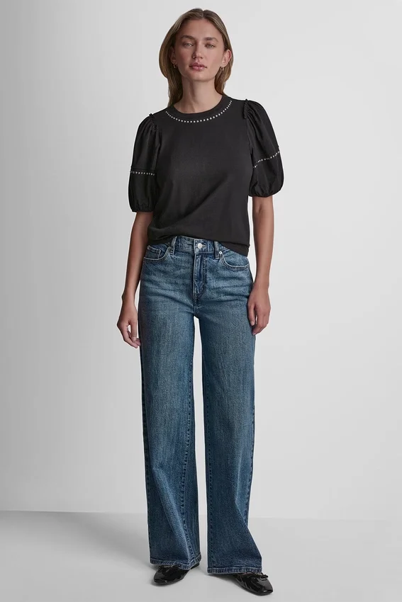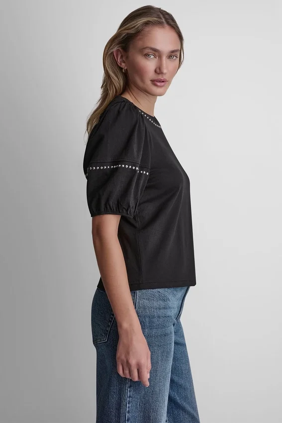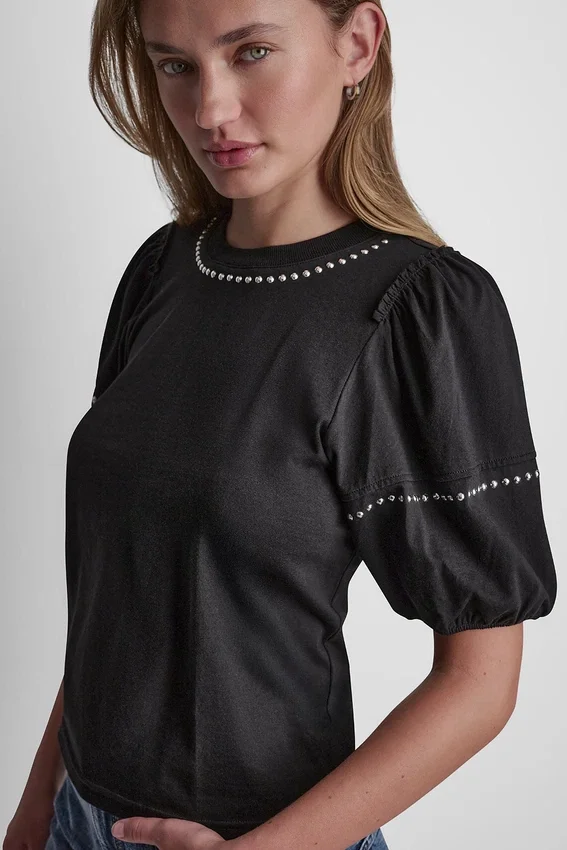Elevated with Subtle Shine, This Crew Neck Tee Features Dome Stud Detailing and Mini Ruffle Puff Sleeves for a Feminine Finish. Crafted in Soft Cotton with a Regular Fit, It’s an Easy Statement Piece for Everyday Styling.