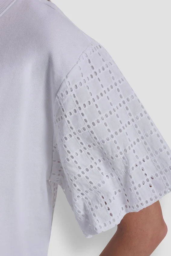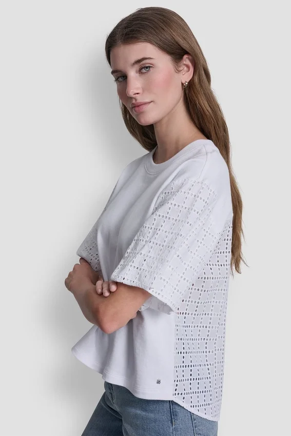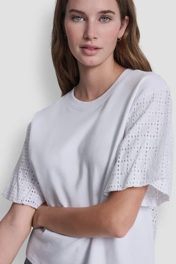 Pull-On Style Regular Fit Crew Neckline Short Puff Sleeves Eyelet Back Detail Unlined Knit Front: 100% Cotton Woven Back and Sleeves: 100% Cotton Machine Wash Cold with Like Colors, Inside out Only, Gentle Cycle; Do Not Bleach; Dry Flat; Cool Iron if Needed; Do Not Dry Clean Imported Style #: Dj6T1731