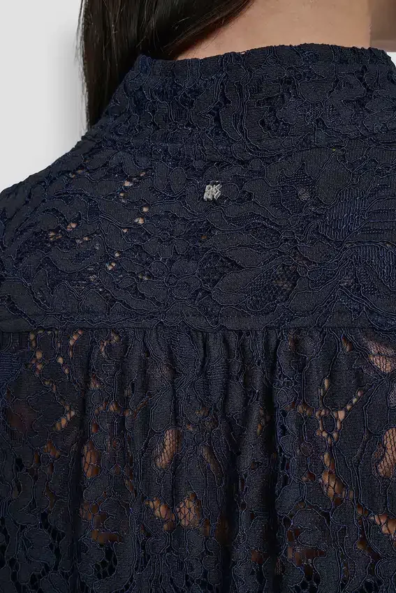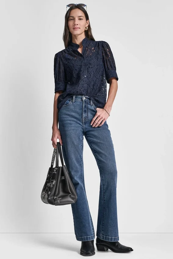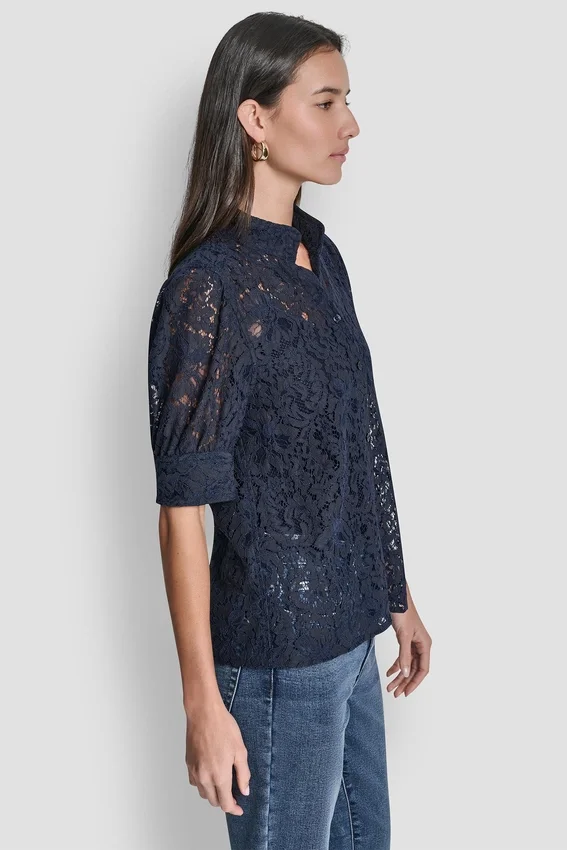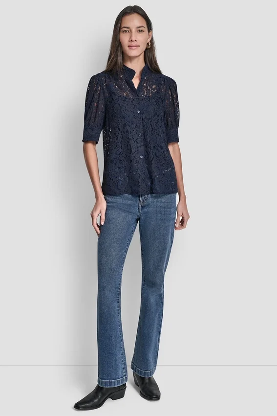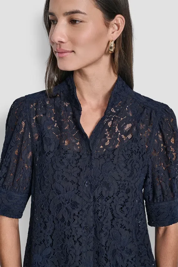 A Polished Warm-Weather Essential, This Lace Puff-Sleeve Shirt Combines a Structured Stand Collar with Delicate Lace Sleeves for a Feminine Yet Tailored Finish.