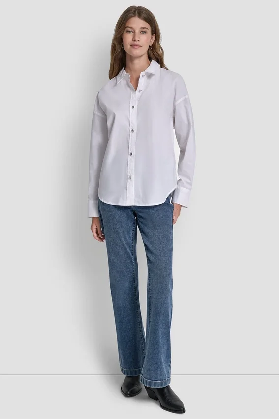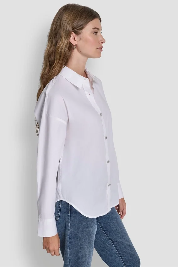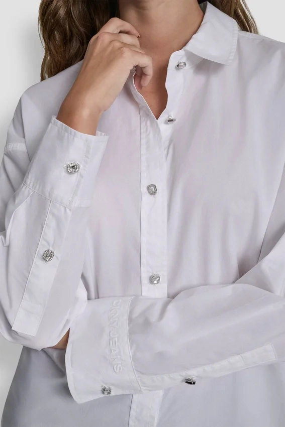 Collared Neckline Button-Front Closure Long Sleeves Encased Elastic Detail at Back 100% Cotton Poplin Machine Wash Cold, Gentle Cycle; Only Non-Chlorine Bleach When Needed; Tumble Dry Low; Cool Iron if Needed. Imported Style #:Dj6W2171