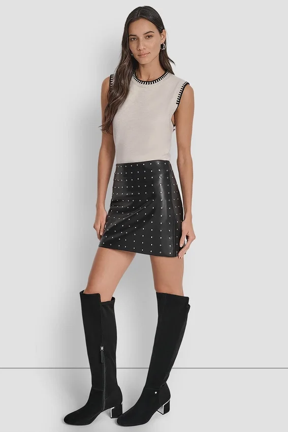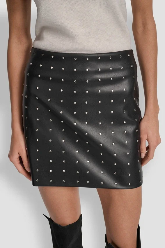 Edgy Yet Refined, This Embellished Faux Leather Mini Skirt is Designed to Stand out While Keeping Its Sleek, Modern Attitude.