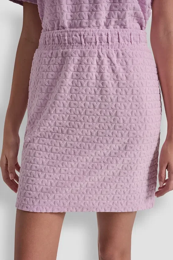Mini Skirt Pull-On Elastic Waist Logo Jacquard Design Unlined Two Front Hand Pockets Fabric: 98% Polyester, 2% Spandex Care: Machine Wash Cold with Like Colors Inside out; Gentle Cycle. Do Not Bleach. Dry Flat. Cool Iron if Needed. Do Not Dry Clean. Imported Style #: Dj6K9611