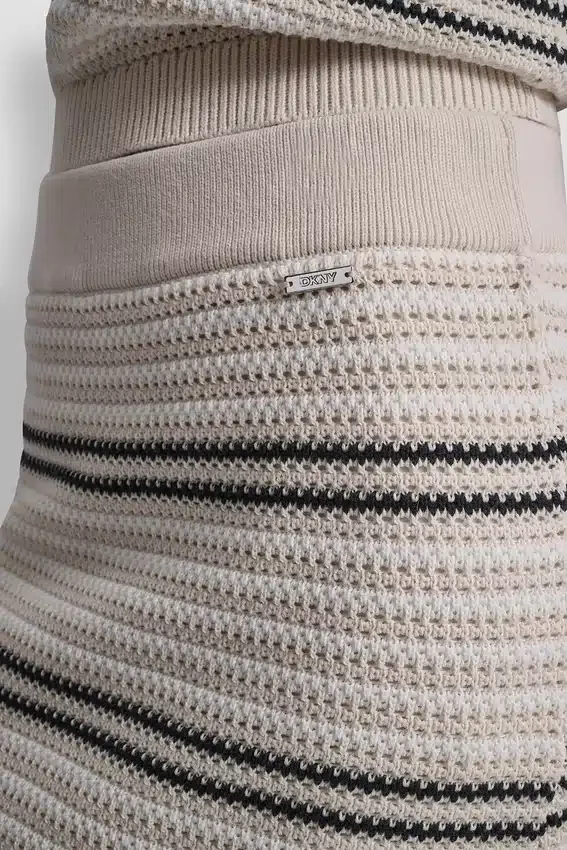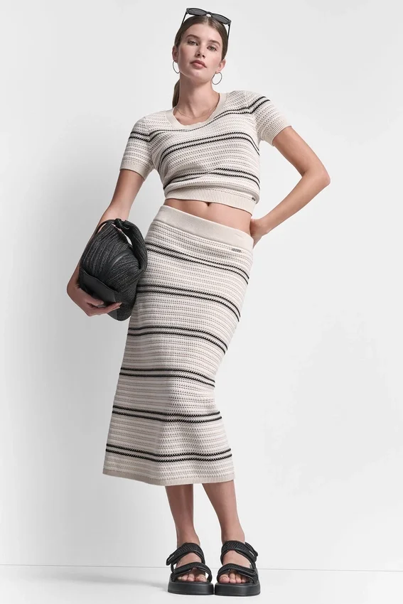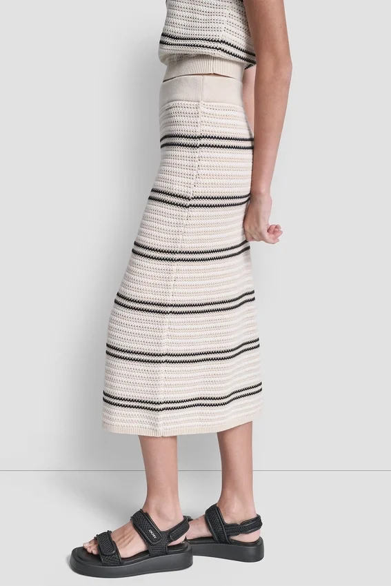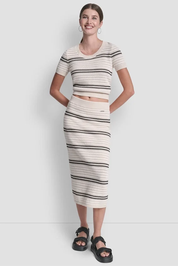 Polished and Feminine, This Striped Midi Skirt Features Delicate Pointelle Stitch Detailing and a Sleek Pencil Silhouette. Finished with a Subtle Logo Bar Accent, It’s a Refined Piece Perfect for Coordinated Set Styling or Elevated Everyday Wear.