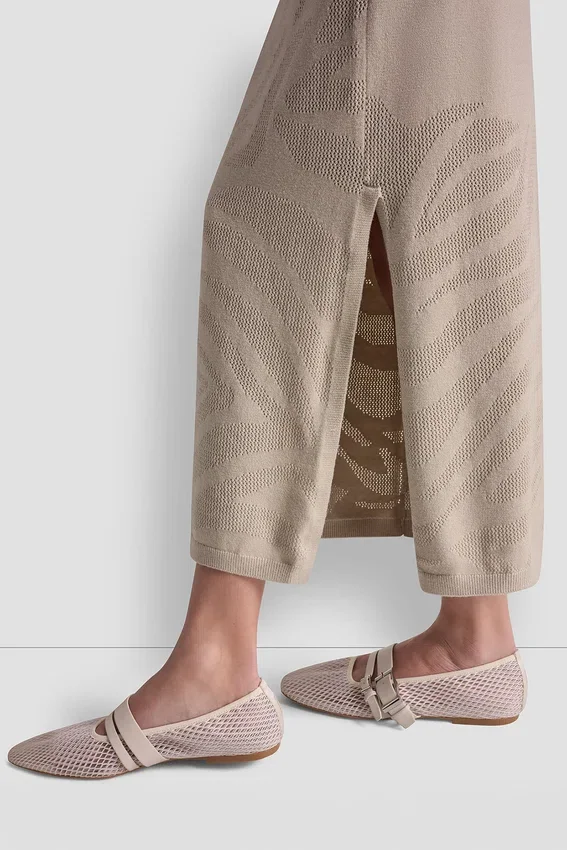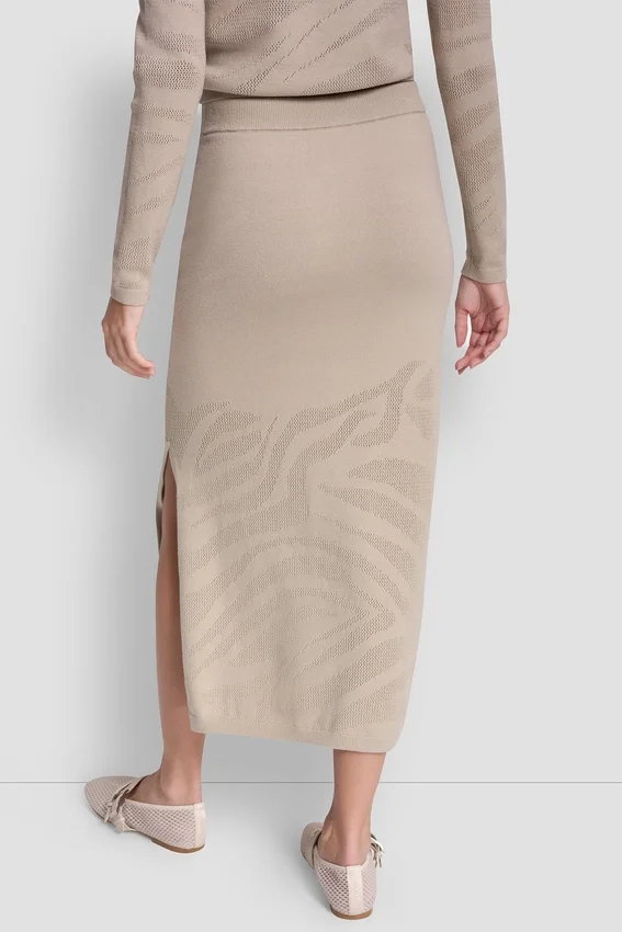 A Sleek, Modern Take on a Classic Midi Silhouette, This Engineered Zebra Pointelle Skirt Brings Refined Texture and Effortless Sophistication to Any Look. Designed with an Open-Stitch Pattern and a Subtle Front Slit, It Offers a Flattering Pencil Shape That Moves with You.