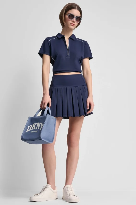 Serve Sporty Energy All Day in This Pleated Tennis Skort—Moisture Wicking Pique Keeps You Cool While a Slouchy Polo Sweatshirt and Classic Trainers Have You Covered.