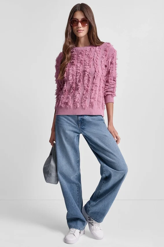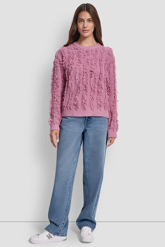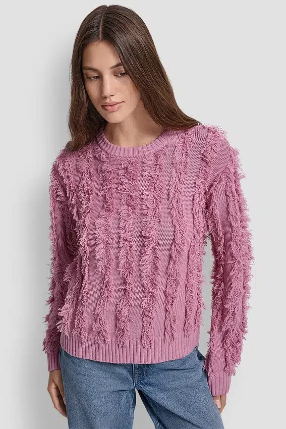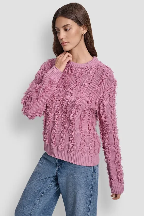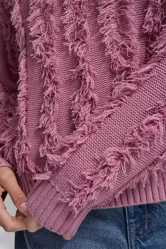 - Long Sleeve Crew Neck Sweater with Fringe Stitching