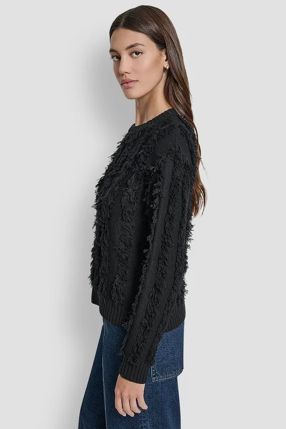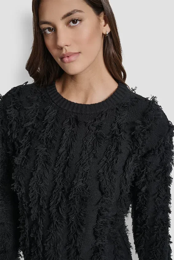 • Long Sleeve Crew Neck Sweater with Fringe Stitching