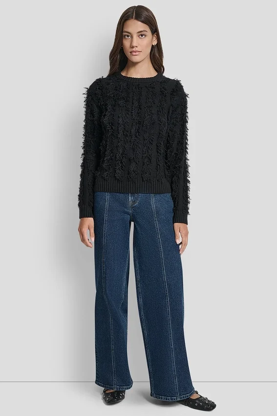 A Timeless Crew Neck Silhouette Elevated with Fringe Stitching for a Subtle Statement—Perfect for Layering or Wearing Solo from Fall Through Winter.